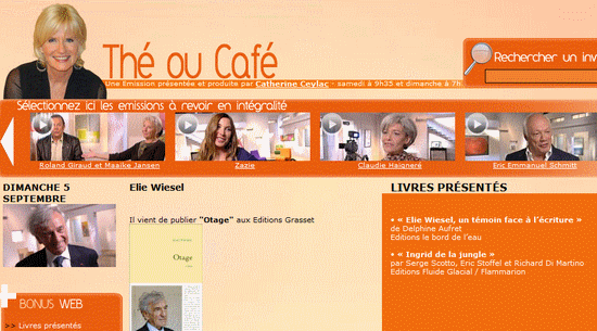 La France qui se lève tôt même le dimanche s’est étonnée et interrogée sur l’étrange conclusion du « Thé ou Café » du dimanche 5 septembre, auquel Catherine Ceylac avait invité Elie Wiesel : en lieu et place du petit cadeau habituel, sous un prétexte fumeux on vit et surtout entendit l’animatrice offrir au Prix Nobel de la Paix… 10 secondes de silence (moment rare à la télévision) !