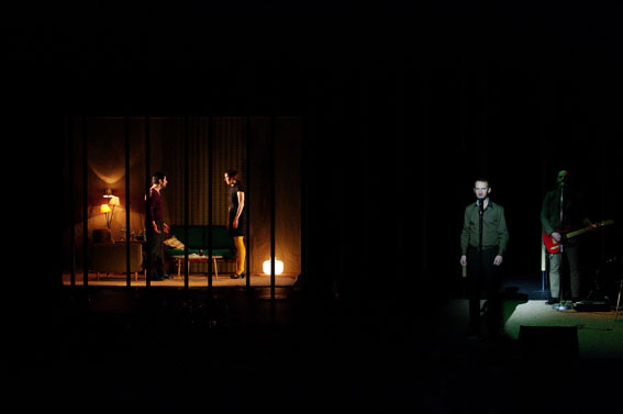 Alexis Armengol s’est imprégné de cette œuvre, choisissant la traduction d’André Markowicz et Françoise Morvan. Avec finesse, tout en évitant malicieusement les formes narratives traditionnelles, il nous propose ce Platonov mais, agréable apéritif tchékhovien, servi sous la forme d’un théâtre-concert. Dialogues tumultueux, chant et musique (piano et guitare) viennent se frotter à l’attention du spectateur durant deux courtes heures. Platonov mais débute par des retrouvailles entre amis lors d’un week-end. Platonov, personnage central mais indéterminé, nous y apparaît sous des traits sarcastiques, tantôt enfantins, tantôt emplis de gravité. La pièce nous suggère son ascendant moral sur le petit groupe, constitué de Sergueï (fils du général Voïnitsev, mari de Sofia), Nikolaï (frère de Sacha, fiancé de Grékova), Anna (jeune veuve), Sofia (épouse de Sergueï) et Sacha (épouse de Platonov), et plus particulièrement la fascination – parfois répulsive – qu’il exerce sur les trois derniers personnages.