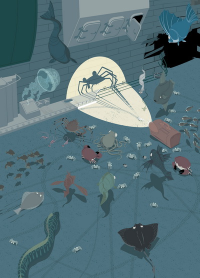 Le journaliste tente de filmer tout ça, d’être le premier témoin de cette révolution du crustacé ! Il sait tout ! Tout a été filmé dans les profondeurs, sur le sable, entre les pattes des touristes. Tel un reporter pour le National Géographique, il diffuse son reportage à un public endormi, et préfère manger la glace en regardant la mer. Et le crabe avance, Ceux qui se battent occupent largement la plage, les rochers eux, sont le terrain d’observation et d’attente des plus costauds, les étourneaux. Et en cachette, sous l’eau, sous les rochers, ils sortent aussi leurs pinces … plus long, plus fort ! Des crustacés de choix vont débarquer !