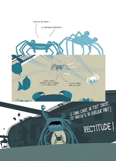 Tourner, tourner vers la révolution, pour envahir, pour changer la vie. Adieu la rectitude, et tant pis pour l’homme qui ne s’en préoccupe guère, juste à vouloir s’empiffrer de plateaux de fruits de mer, et de s’endormir devant un documentaire d’anticipation sur cette manifestation du Simplicimus Vulgaris. L’espèce humaine en danger, mais ce n’est pas grave, une casserole d’eau bouillante, et il en est fini de tout ça ! Arthur De Pins nous plonge encore plus dans les profondeurs, là où tout s’est passé, de la ligne rectitude qui fini sa course en arc de cercle, à la légende de Soleil et Lune, meneurs de la révolution, face à Guitare et les autres qui sont contre cette forme de déplacement contre nature ! Il ne faut rien bousculer, et pourtant … l’évolution d’une espèce va mener à la guerre. Et en hauteur, les gros, les puissants : les étourneaux, dans l’attente de prendre ces crabes en esclavage.