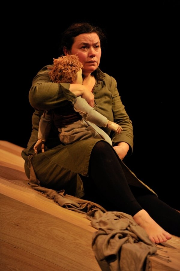 Puis, dans une seconde partie, l’épouse du gouverneur (Natella Abaschvili), qui veut récupérer Michel, assigne en justice sa servante. Le juge (Azdak), personnage loufoque, tranche à sa façon le litige. Même si la pièce pâtit du texte parfois ampoulé de Brecht et de personnages trop stéréotypés (Natella ou le fiancé de Groucha), elle séduit fortement par son mystérieux climat, l’excellence du jeu des comédiens et la crudité sociale du message. Pièce chorale à la scénographie sobre et raffinée, elle enveloppe le spectateur d’un bel élan chorégraphique de lumières et de visages/masques expressifs. Les multiples personnages emblématiques du Cercle de craie caucasien évoluent sur un plateau habité par d’insolites plans de bois inclinés. Ils sont là revêtus de curieuses coiffes de cirque ou d’inquiétants masques de crânes de buffles. Quant à la présence de Michel, elle est subtilement incarnée par le fragile déhanchement d’une marionnette.