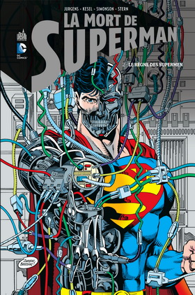 Cet ouvrage est bienvenue, après sa première édition en France chez Panini Comics, désormais, la firme DCcomics est représentée par Urban Comics ( filiale Médias-participation : Dargaud, Le Lombard, Dupuis …) . Nouvelle traduction, et un objet des plus soignés pour envelopper les plus de 500 pages sur ce premier volume. La couverture reprend celui du numéro 75 de « Superman » : la cape sur le piquet de bois, déchiquetée , les stigmates de la bataille entre un monstre et un héros. Dan Jurgens a dessiné cet épisode. Une page entière sans mise en scène, plein cadre sur les deux combattants. Superman est déjà très abîmé, en sang. Doomsday ne l’est pas moins, sa faille à travers ses os ou écailles, voir défenses « dentaires » sont brisés, enfoncé dans le corps … Les deux se donnent un ultime coup pleine page suivante dans l’objectif de l’appareil photo de Jimmy Olsen : deux combattants cambrés … la chute finale sous les yeux d’un autre témoin : Loïs Lane. Les conflits d’hommes s’enchaînent dans une autre violence, autour du corps de Superman. De Lex Luthor II et la complicité naïve de Supergirl, le projet Cadmus , on cherche à extraire l’essence, le code ADN de la puissance d’un tel homme.