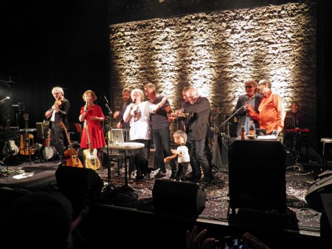 Quelques mots en préliminaires du fameux concert de Ramon bien accompagné du 25 octobre où j’étais présente et où mes larmes de plaisir, ma mère chimpanzé, ont coulé de joie durant plus de deux heures et demie. Outre le trouble de le retrouver en famille avec sa dulcinée Clarabelle toujours aussi splendide et à la voix mélodieuse, qui me transporte sur des airs de Ramon et de ses potes. Outre aussi quelques reprises revues et corrigées, de nouvelles compostions et pléthore de chansons inédites, Ramon ne serait plus Ramon si en plus de jouer sur scène, il jouait aussi de la mise en scène. « Privilégiant le mot et la musique et le décorum », comme il le dit lui-même à ses années Au Bonheur des dames et Odeurs, du temps de sa splendeur et de sa jeunesse. Avec toujours le sous-entendu que ce seront ses derniers concerts. Il nous fait le coup tous les deux ans environ, mais je ne le crois pas. Même si la préparation assidue des concerts lui a pris 6 mois à plein temps. Lui Ramon, le desperado humoristique de talent et de qualité de la chanson, le grand oublié des médias, gage pour l’homme subversif qu’il demeure sans peur et sans reproche, toutes griffes dehors, ce qui prouve envers et contre tout sa notoriété avérée. Tu m’étonnes, merdre de merdre aux radios qui chialent toute la journée et racolent aux hymnes de la médiocrité. Merdre de merdre encore aux canards boiteux qui se râpent le gruyère en serpillère. Sur scène, Ramon prouve qu’un morceau composé avec une seule note et soutenue par une machine à rythmes sur des paroles à la Kong représente le quotidien du décervelage ambiant. Alors que ne désemplit pas le Café de la Danse à chacun de ses concerts. Je confirme, son public lui reste fidèle. Le bouche à orteils fonctionne de plus belle. Toutes les générations confondues sont sorties tout sourire de ses deux premiers concerts. Inventeur encore et encore, amoureux fou des bons mots à l’humour fin et débordant (hum quel régal), il twitte des textes de 140 signes pour 140 notes, ce qu’il appelle ses twongs avec son complice Camille Saféris au vocal. Il convie pour danser au Palace la marionnette qui a sa face et se démantibule tant et plus les membres, qu’il m’est si difficile de la garder dans mon viseur. Faudra qu’il me présente sa marionnette. Elle est trop chouette ! Sans parler de ses musiciens toujours très impliqués et solidaires de son œuvre unique et joyeuse.