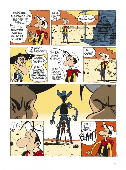 C’est quand même assez osé de dessiner le même personnage dans sa tenue de tous les jours. Ne vous inquiétez pas, Bouzard sait y remédier. Sans que les fringues de Lucky s’usent après des décennies de bons et loyaux services et ignorent la cible infernale des effets de mode. A méditer.
