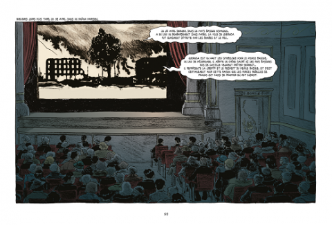 Dans son atelier parisien, son modèle Dora Maar pose, dialogue et l’encourage. Picasso se désespère : « Ca fait des mois que je cherche une idée. Et rien ne vient de vraiment bon » (page 16). C’est finalement le 30 avril lors de la diffusion des informations en images dans un cinéma parisien que Picasso a un déclic : Guernica ! Il entreprend de couvrir de ses chimères une toile de 7,50 m sur 3, 50 pour illustrer son ressenti de Guernica. « J’y retrouve toute la souffrance, l’horreur et la furie de la guerre » commenta Dora (page 65). Très complice, elle entreprend des clichés photographiques qui vont permettre au peintre d’avoir le recul nécessaire qui lui manque devant l’étendue de sa fresque monumentale. Il veut capter le public et considère cette toile comme une arme contre Franco et le fascisme. Il est à noter que Bruno a bénéficié de l’accord de la Fondation Picasso pour publier sa BD.