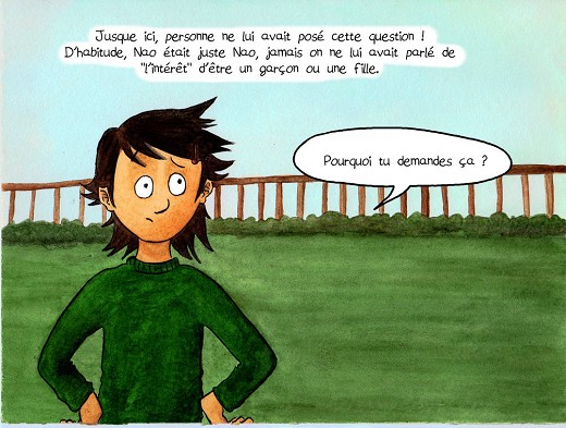 Nao a une réplique cinglante et de bon sens du genre : « Vous savez, c’est pas clair vos histoires. Un coup je suis un garçon, mais en fait je suis une fille, mais en fait je suis plutôt un garçon. Ca me casse la tête tout ça. Moi je crois que c’est à personne de décider qui je suis. Il y a que moi qui peux savoir, et je choisis ni l’un ni l’autre. Je veux pouvoir jouer à ce que je veux, un point c’est tout ».