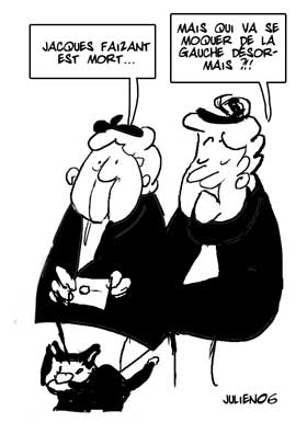 L’année 2006 apporte son lot en décès d’illustrateurs de Bande Dessinée : JACQUES FAIZANT est mort. Il était un, de ses rares talents, apprécié par le Général De Gaulle ! Faizant était le dessinateur fidèle du journal Le Figaro. Il était le seul à se moquer de la gauche et porter une affection particulière à François Mitterrand.