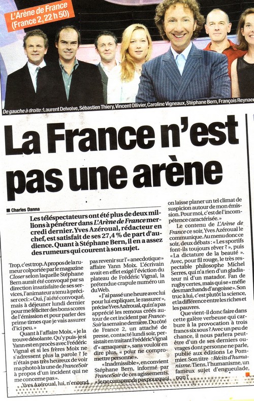 Mercredi 11 Octobre, France Soir revient pour la troisième fois sur l’affaire MOIX/VIGNALE lorsque l’écrivain-réalisateur a censuré le responsable du Journal LE MAGUE lors de l’enregistrement de L’Arène de France sur France 2.