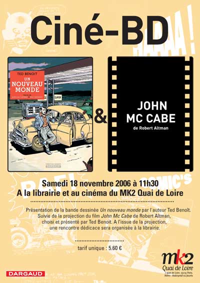 Présentation de la bande dessinée Un nouveau monde par l’auteur Ted Benoît, suivie de la projection du film John Mc Cabe de Robert Altman, choisi et présenté par Ted Benoit.