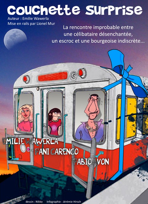 Du rire, et ça continue, au même endroit, Emi récidive en écrivant et en interprétant une comédie intitulée : COUCHETTE SURPRISE.