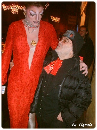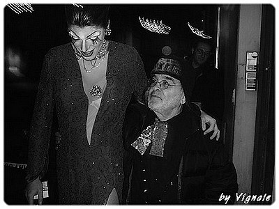 Fernando ARRABAL (l’écrivain de la bonne morale franco-espagnole) surpris en pleine rue avec un transexuel montre un bonheur et un plaisir manifestes avec cette créature de la nuit en rouge et noir.