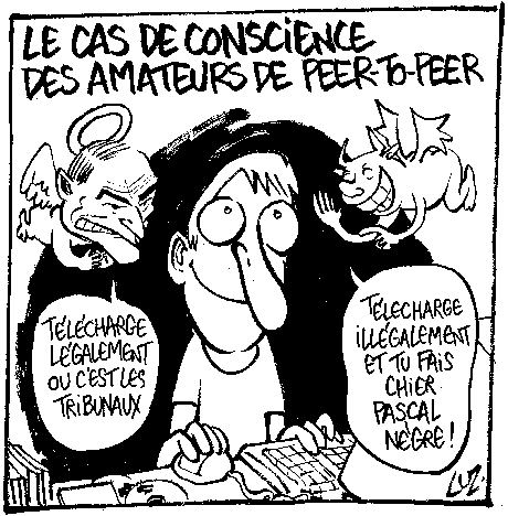 Le dessinateur de presse et BD LUZ s’est vu refusé via la rédaction du célèbre magazine de rock rebel "Les INROCKUPTIBLES" un dessin sur le téléchargement Peer to Peer des MP3 et de la musique de chez Universal(e), avec un ange de conscience et la tête de Pascal Nègre, son aimable président, initiateur de procédures juciciaires contre de braves internautes.