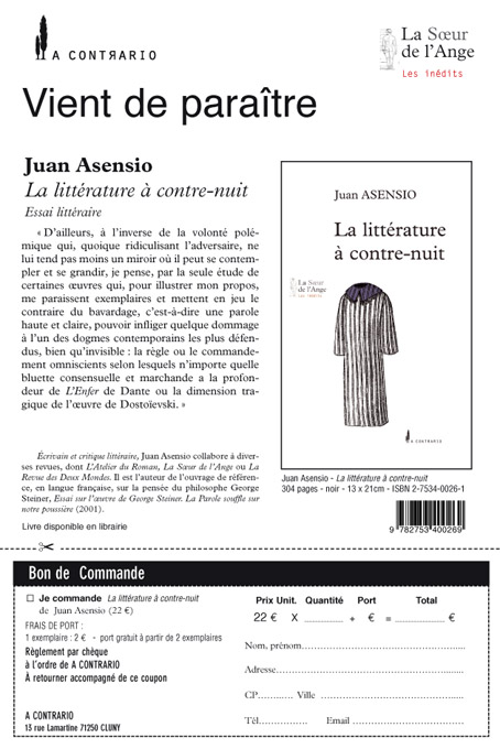 Contrario dirigées Matthieu Baumier, du deuxième livre de notre ami Juan Asensio, un essai consacré à la question de la littérature et du Mal, intitulé "La littérature à contre-nuit".