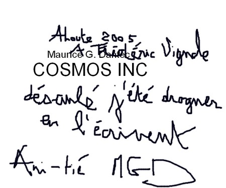 Ayant grand besoin d’argent (comme d’habitude) notre fondateur bien aimé se voit obligé de mettre aux enchères sur E-bay un exemplaire dédicacé de Cosmos Inc., le dernier livre de Maurice G. Dantec (Albin Michel) dédicacé par l’auteur HIMSELF.